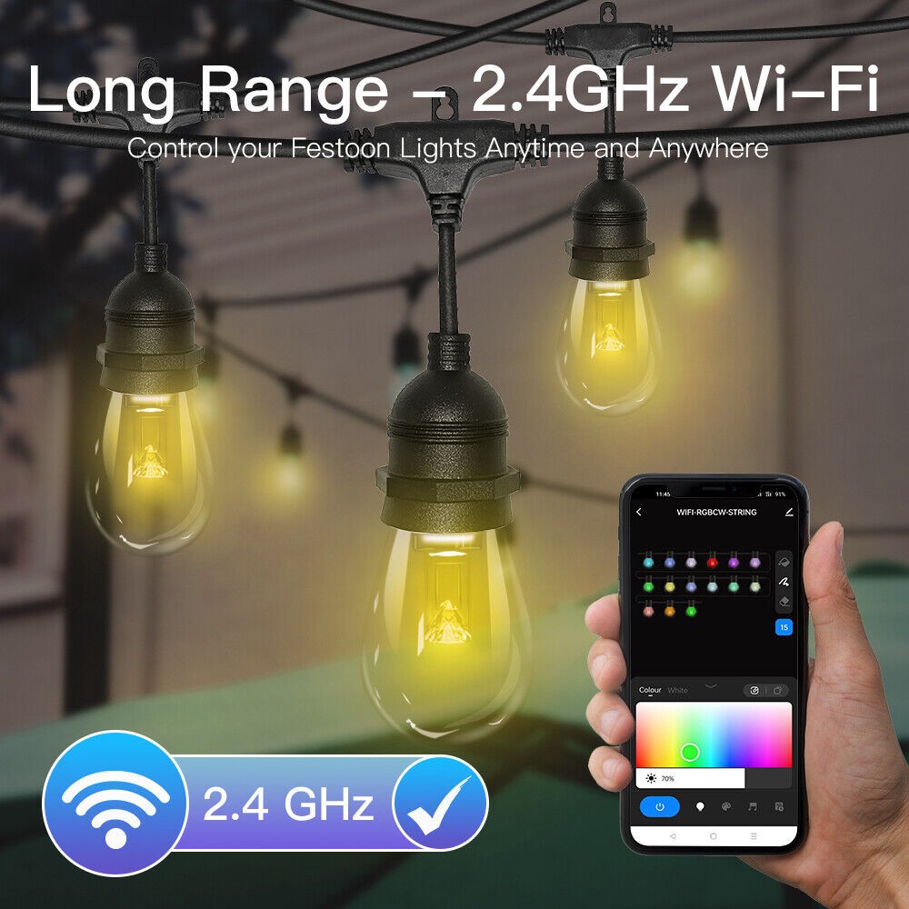 ?Connectable Festoon Lights--- Up to extend connect 3 string lights kits together (Each set 15M/48ft) by Male-Female connector, and up to control 45 Bulbs via WiFi App directly, no need to pair again; Ideal for patio, deck, backyard fence, pergola, porch, bistro, cafe.