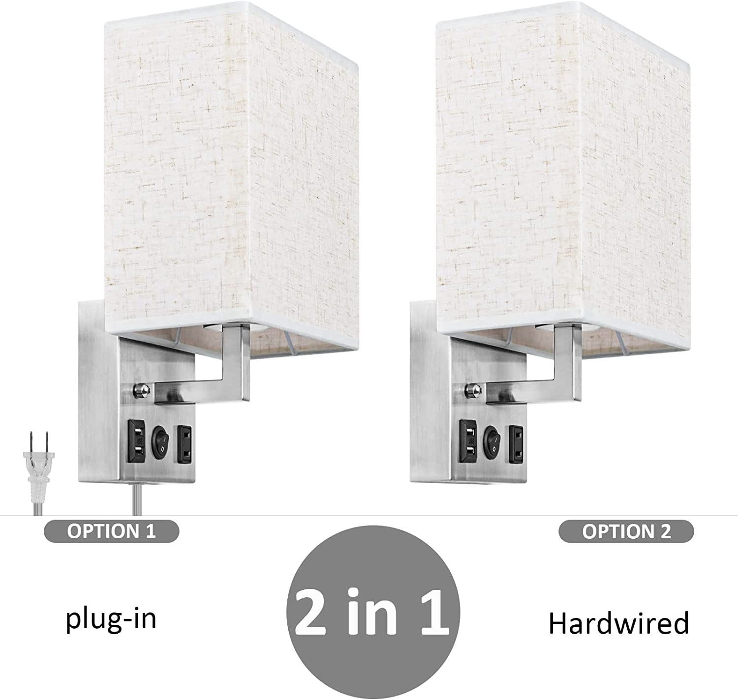Bedside Wall Lamp Set of 2 Plug in Wall Light with Usb Charging Ports and Ac Out