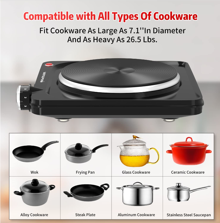• COMPATIBLE WITH ALL COOKWARES: Works with 120V/1500W power supply. Perfect solution for frying, stir-frying, cooking soup and slow cooking. Different than an induction cooker, VAYEPRO burner can be used with any flat-bottomed cookware made of a variety of materials. Examples are frying pans, woks or stove top teapots made from aluminum, stainless steel, ceramic or glass.