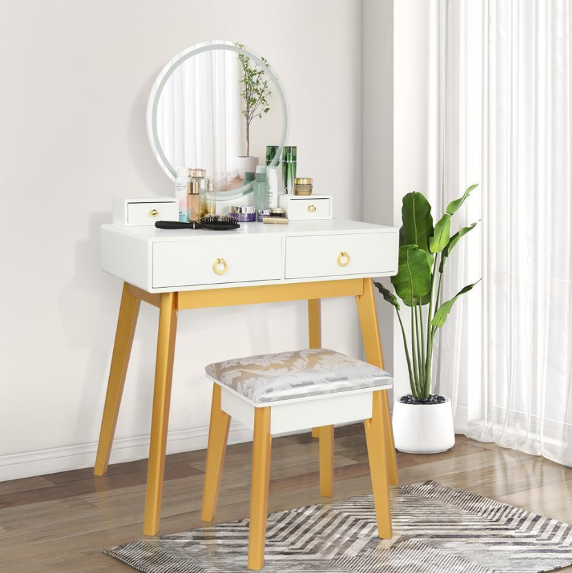 This is a very fashion, modern and simple dressing table. Adopting sturdy MDF and cylindrical solid wood leg support, the dressing table is full of modern sense. Large glass round mirror on the tabletop can show your beauty. Two small drawers and storage cases on the desktop can store your jewelry and cosmetics. Two drawers on the table with a panel can make a good classification for your cosmetics. When you are not using it, you can also remove it as a desk or other table. This dressing table can be placed in the living room, bedroom, or anywhere you want, which can provide the most beautiful furniture decoration for your home.